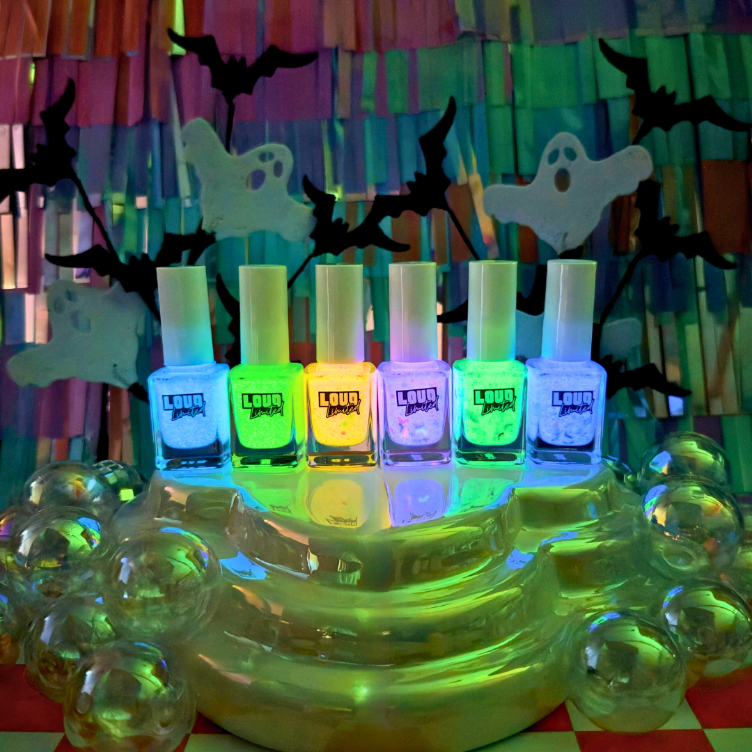 Halloween came early and it’s glowing brighter than ever. The Creepy Cuties lineup is six shades of pastel perfection, each one glowing in the dark and sparkling with flakes, shimmers, and spooks. From sugary-sweet candy vibes to eerie little bat-filled brews, these polishes are all about playful chills and cute thrills.