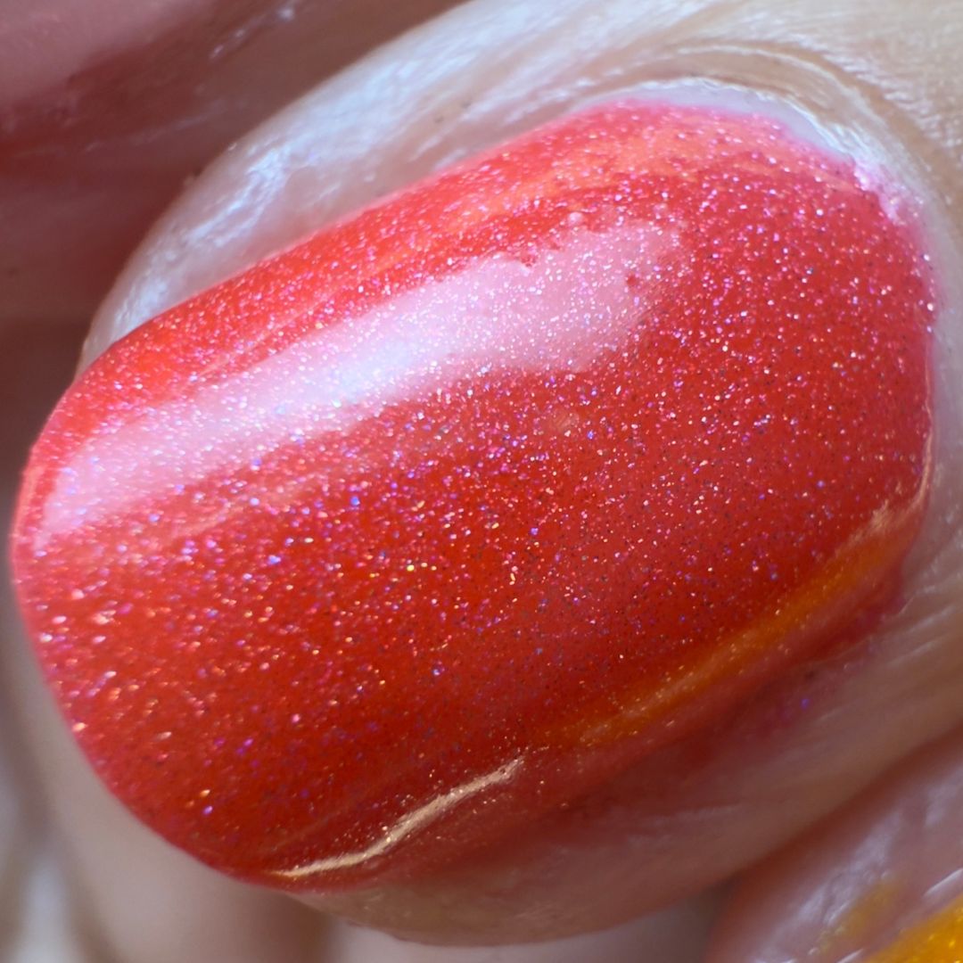 Cherry red holographic with an orange glow that burns like stage lights and bad decisions. Love Me Red is your encore moment: loud, dramatic, and maybe just a little toxic.
