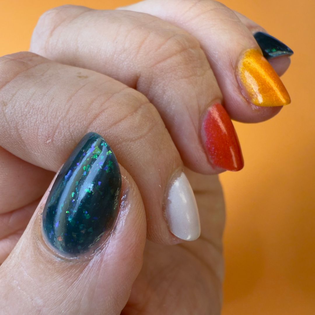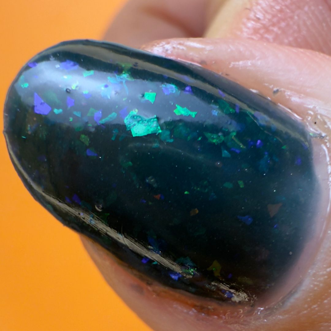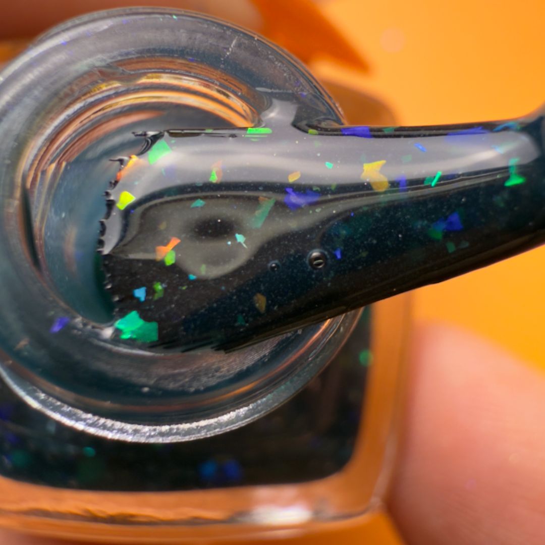 A swampy blue-green with eerie iridescent flakes and a base that glows teal in the dark. It’s a love song sung underwater, murky, moody, and stubbornly beautiful even when it shouldn’t be.