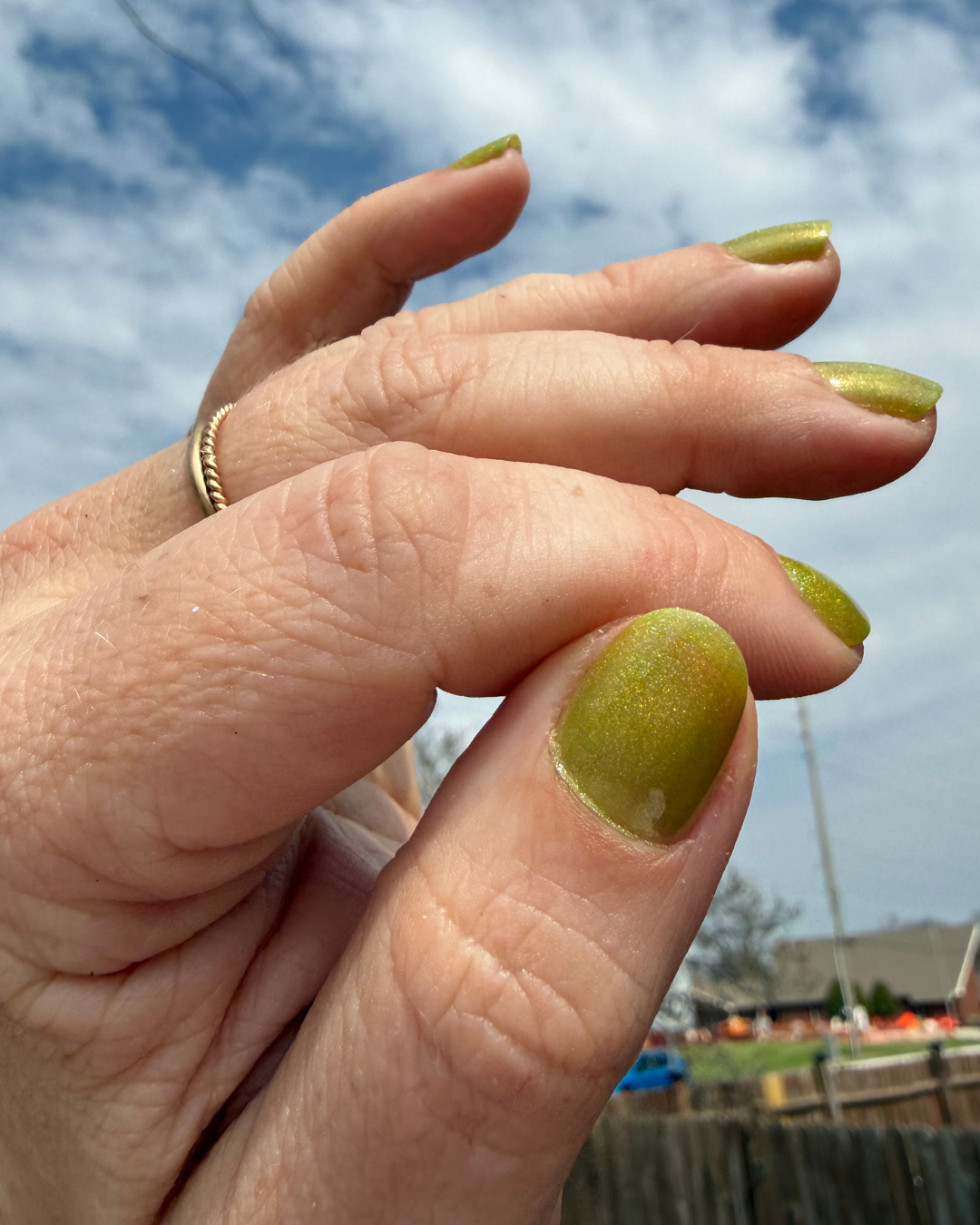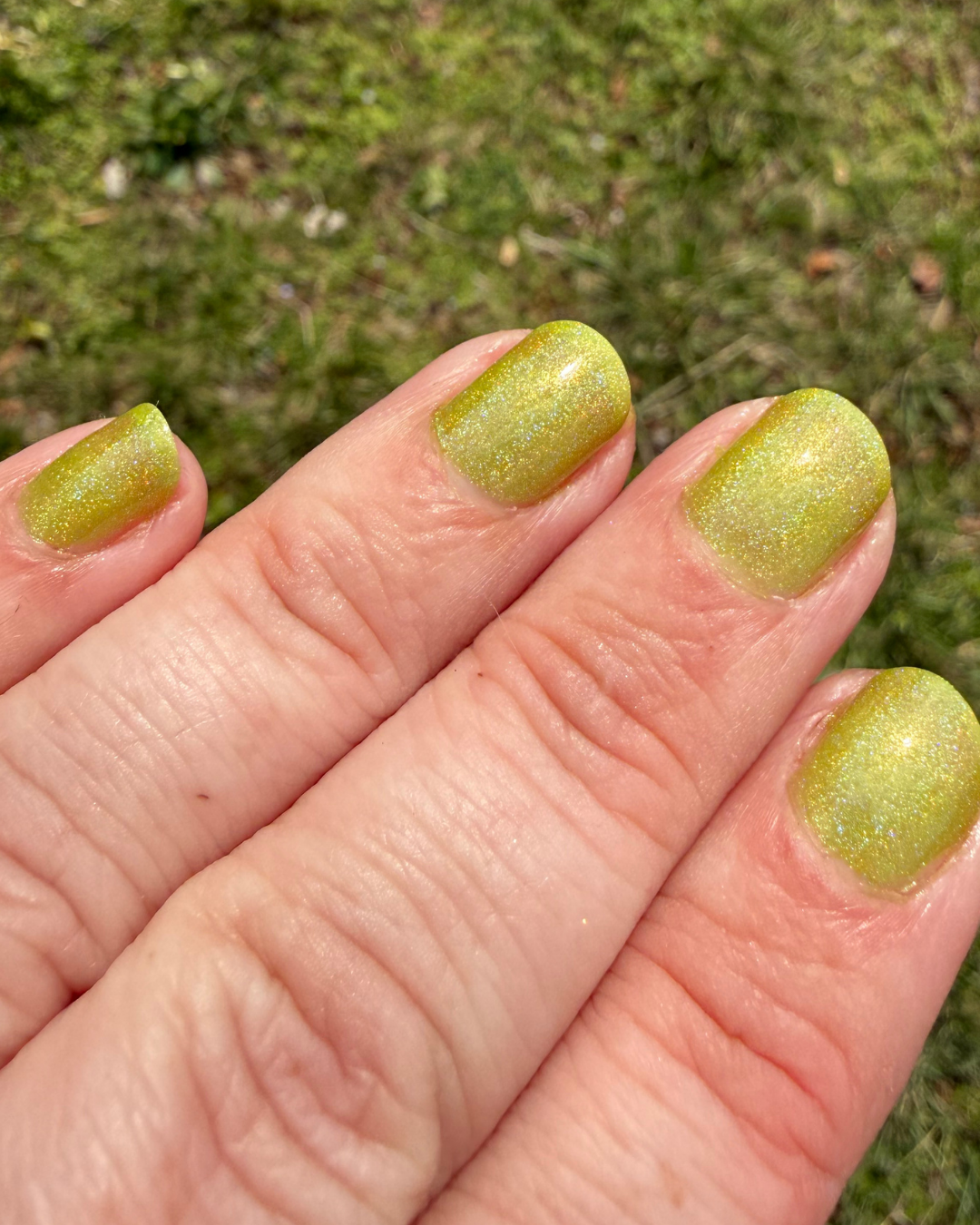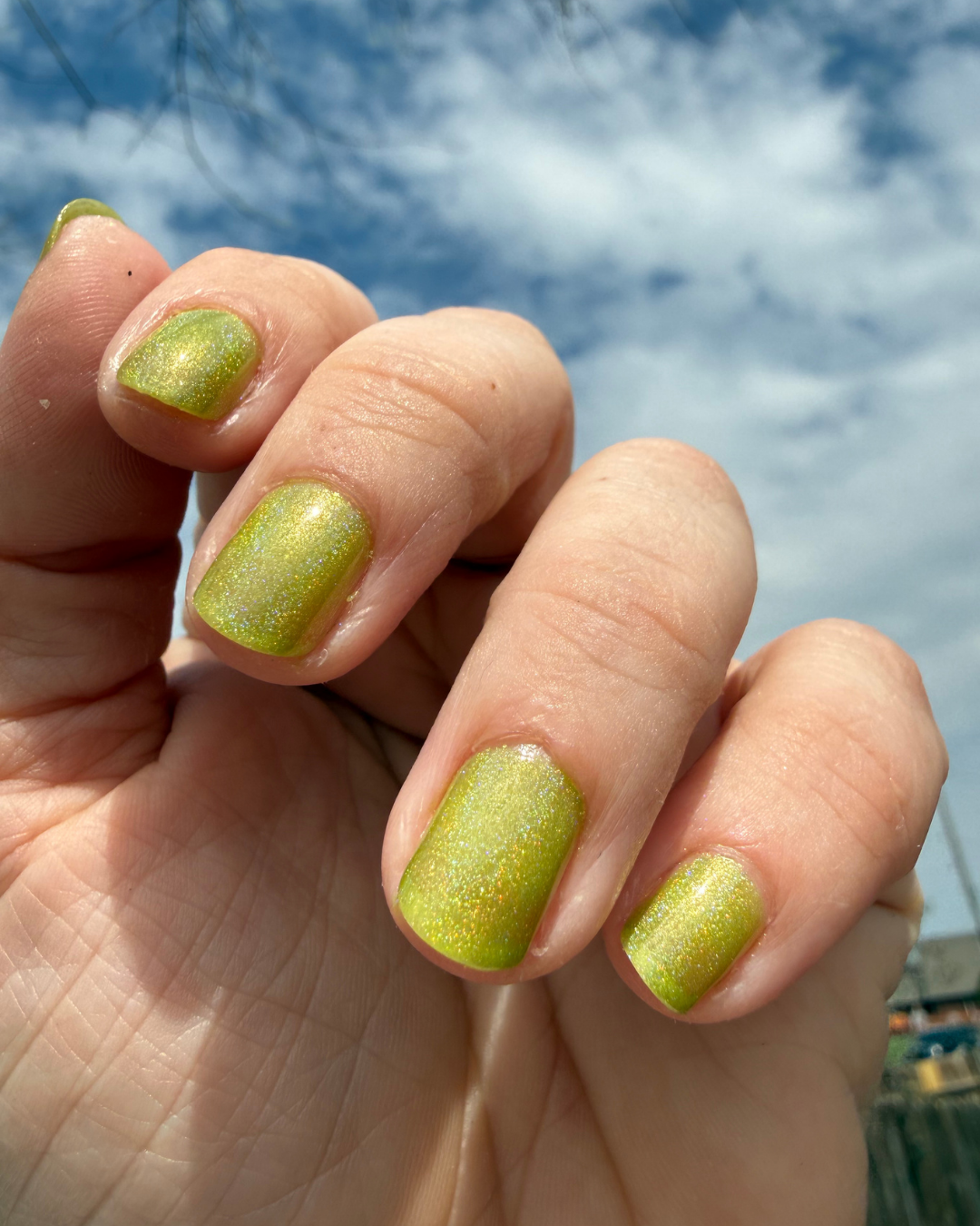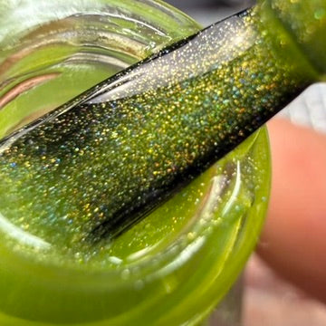 A holographic green inspired by Greg’s apartment. Bright, shifty, and full of sparkle that hits from every angle.