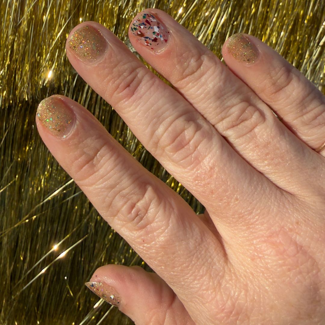 A warm gold glitter in a sheer jelly base with holographic and reflective glitter that glows when it catches the light. This one is about giving yourself permission to want something shiny and lovely just because. No occasion, no explanation, just yes.