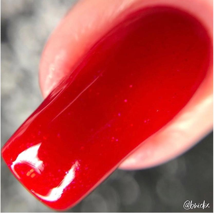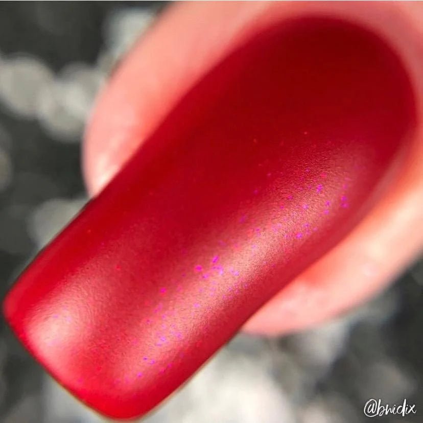 A deep red with magenta micro glitters that come out to play in the light. Which is right where you should always be!