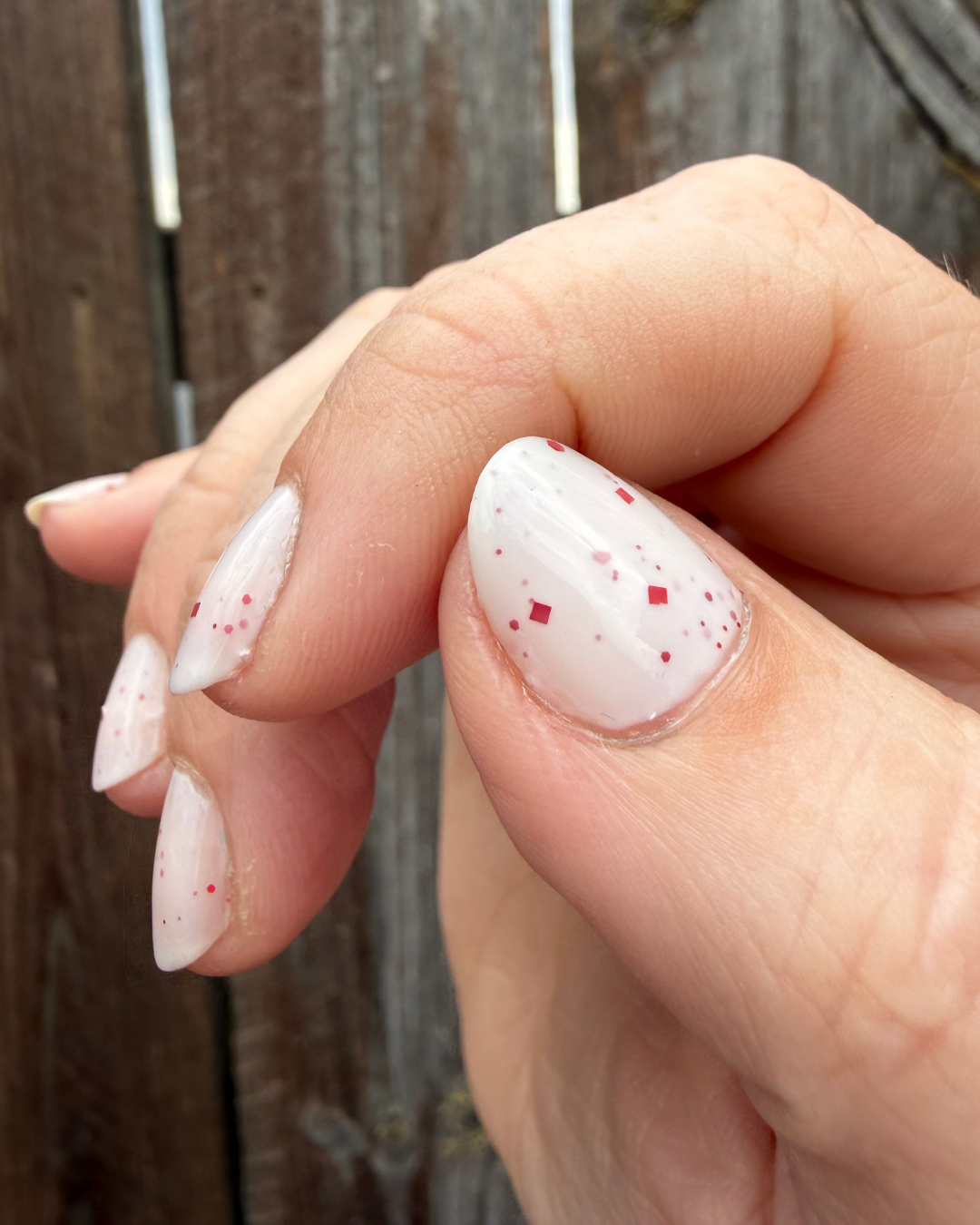 A soft white crelly base loaded with red glitters. Not technically from the album, but we needed it anyway… because we want it with whipped cream on it.